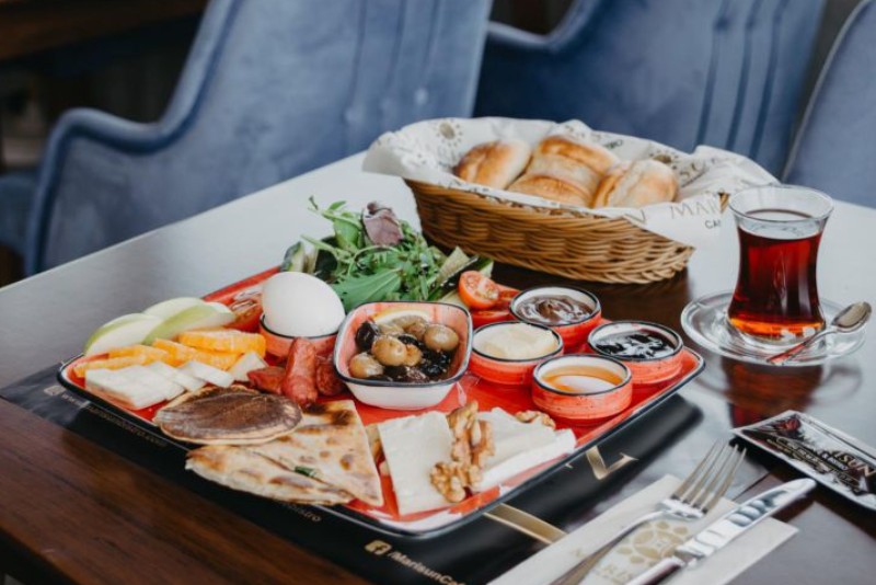Boiled eggs white cheese cheddar cheese hellim cheese olives sausage butter honey jam tomato cucumber nutella fried patatoes