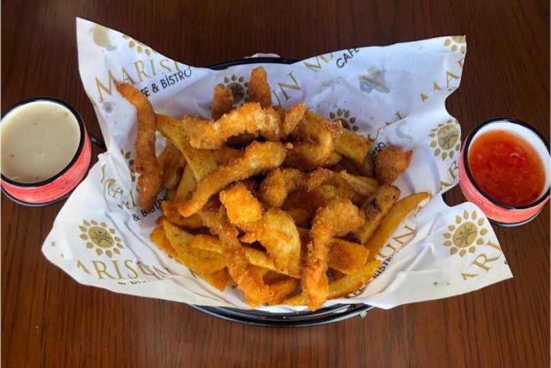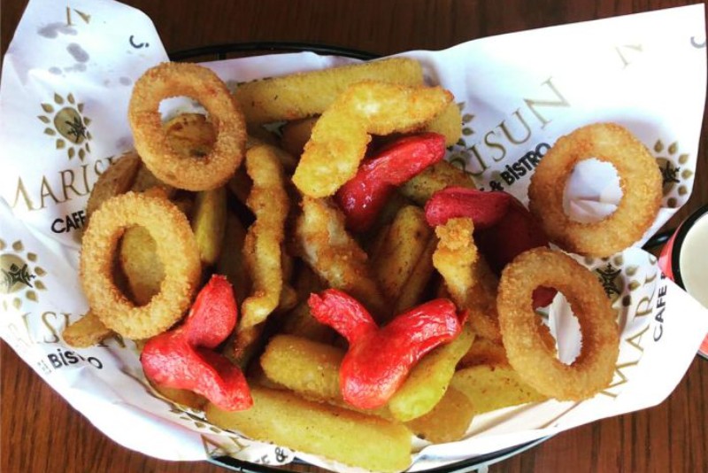 Chicken Fingers Onion Rings Mozorella Sticks Fried Patatoes and Patato Wedges Sausage.