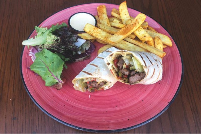 Fillet Steak Piecesi Peppers Onion Mozorella Cheese Frech Fries Tortilla Bread and Greens.