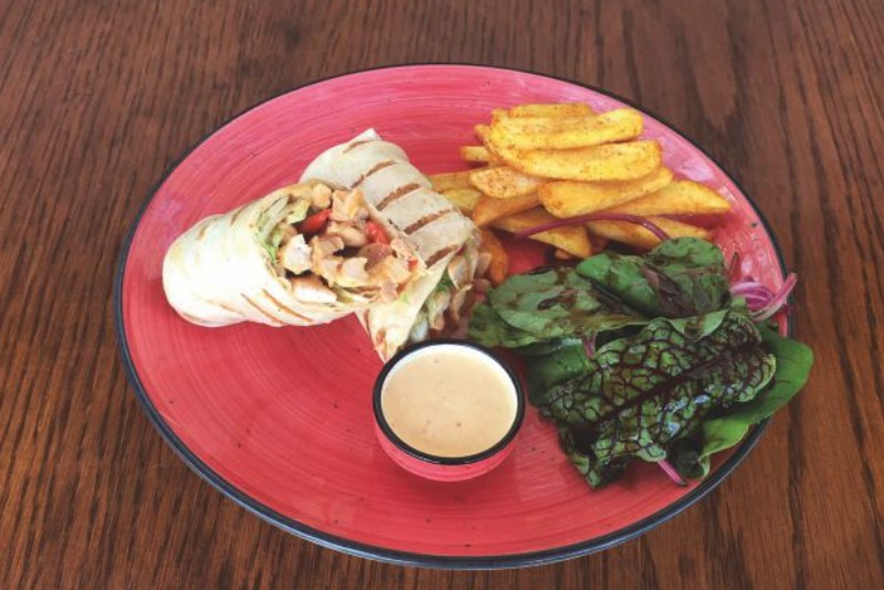 Fillet Chicken Pieces Pepper Onion Mozorella Cheese Frech Fries Tortilla Bread and Greens.